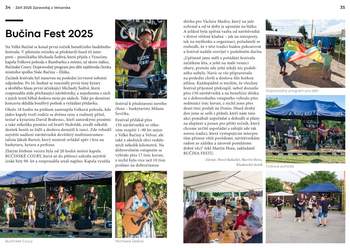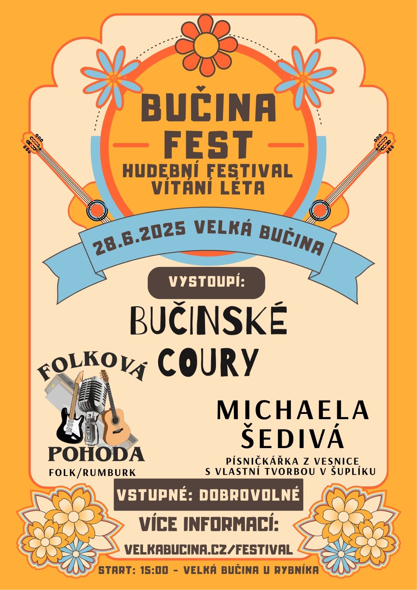 Dne 28.6.2025 se na Velké Bučině uskutečnil pilotní roční hudebního festivalu BUČINA FEST 2025. Festival se těšil velkému zájmu publika, níže kromě plakátu přinášíme i zmínky v médiích.